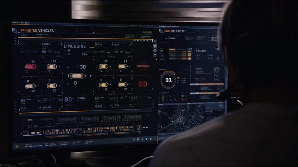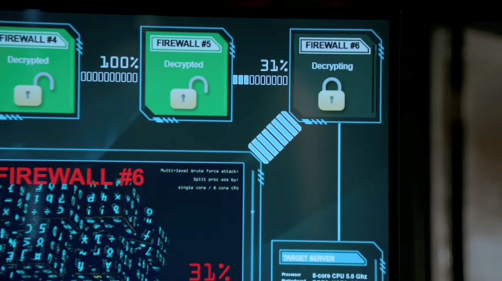 Bu sahnada hammasi ajoyib: raqamli kubik rubiklar, hujum jarayonining indikatorlari, fayrvollarning aniq soni, mushukchalar aks etgan spam video, buzib kirilishi ovozlari va hattoki tizimni ishdan chiqaruvchi kiber bomba. Xakerlarning amaliyoti juda katta tezlikda amalga oshib, juda tez tugaydi.