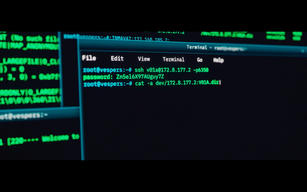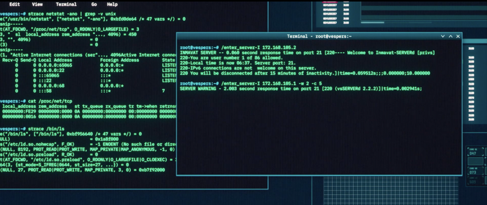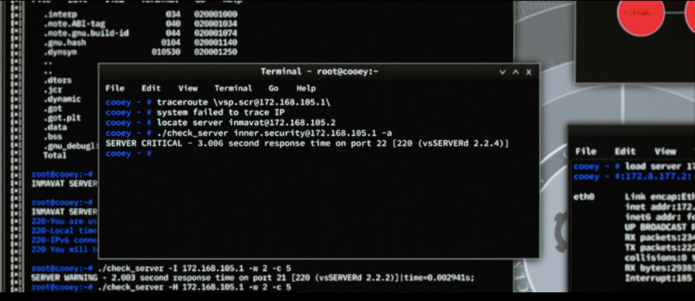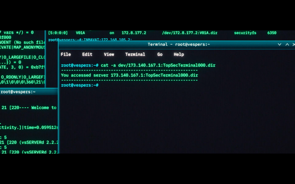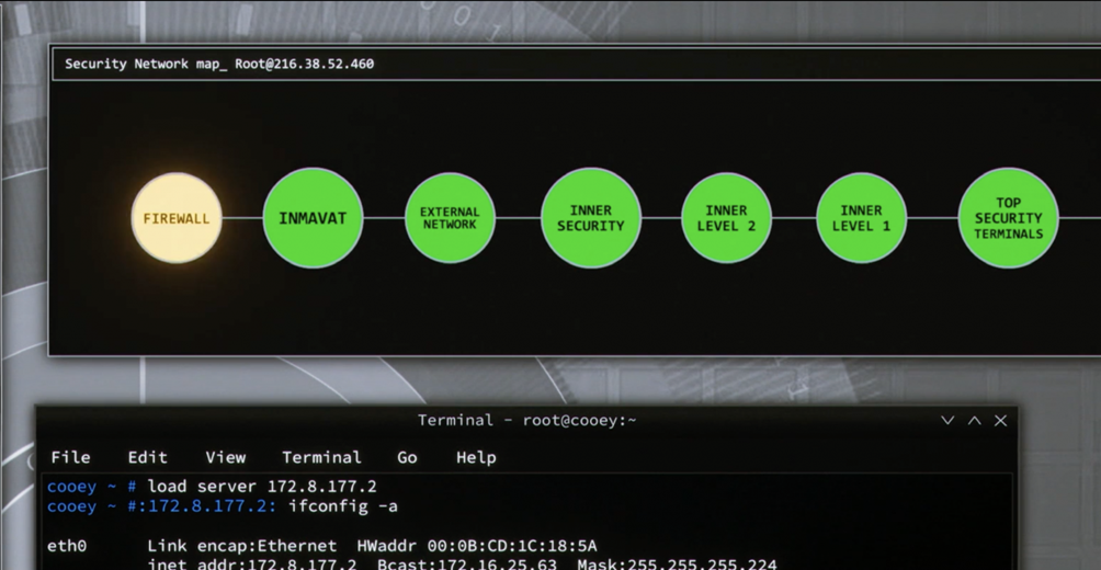 Asosiy ekranda biz cat buyrug’ini va qandaydir tarmoq interfeysiga o’xshagan “narsa”larni ko’rishimiz mumkin. Rejissor bu buyruq bilan xaker qandaydir maxfiy terminalga ulanganini ko’rsatishga harakat qilgan. Bu haqida buyruqdan keying qator ko’rsatib turibdi “You accessed…