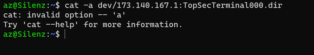 Shunchaki eslatma: cat buyrug’i *nix tizimlarda umuman boshqa vazifani bajaradi – ekrandagi holatda “dev” katalogidagi “173.140.167.1:TopSecTerminal000.dir” fayli ichidagilarni matn holatda chiqarib beradi.